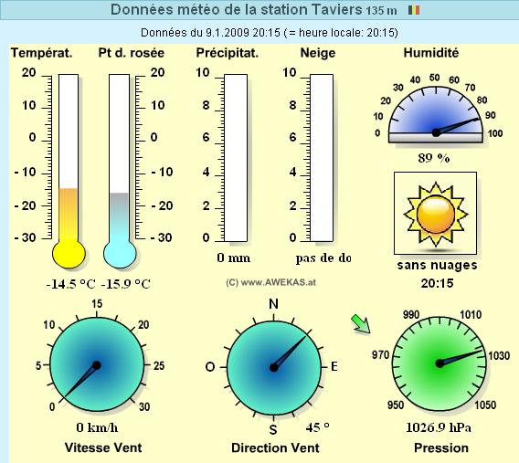 fou_dlespace 0 Posté(e) 9 janvier 2009 Vezin, ciel étoilé 7 cm de neige au sol Température actuelle : -8,9°C Température min de la journée : -12,1°C Température max de la journée : -1,9°C Pression atmospérique : 1027,3 hPa Humidité : 86 % bonne soirée... Partager ce message Lien à poster Partager sur d’autres sites