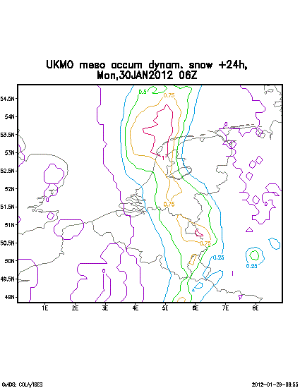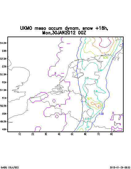 Voici les résultats pour la neige de demain sur la Belgique (modèle UKMO fine mesh : résolution 10km):