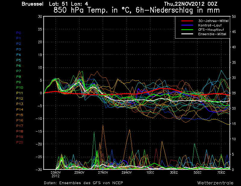 Il suffit de regarder le diagramme pour Bruxelles pour comprendre , il y a 2-3 jours encore , la moyenne des scénarios ne descendaient pas sous 0° . Elle est aujourd'hui située à environ -4° pour le 30/11 ...