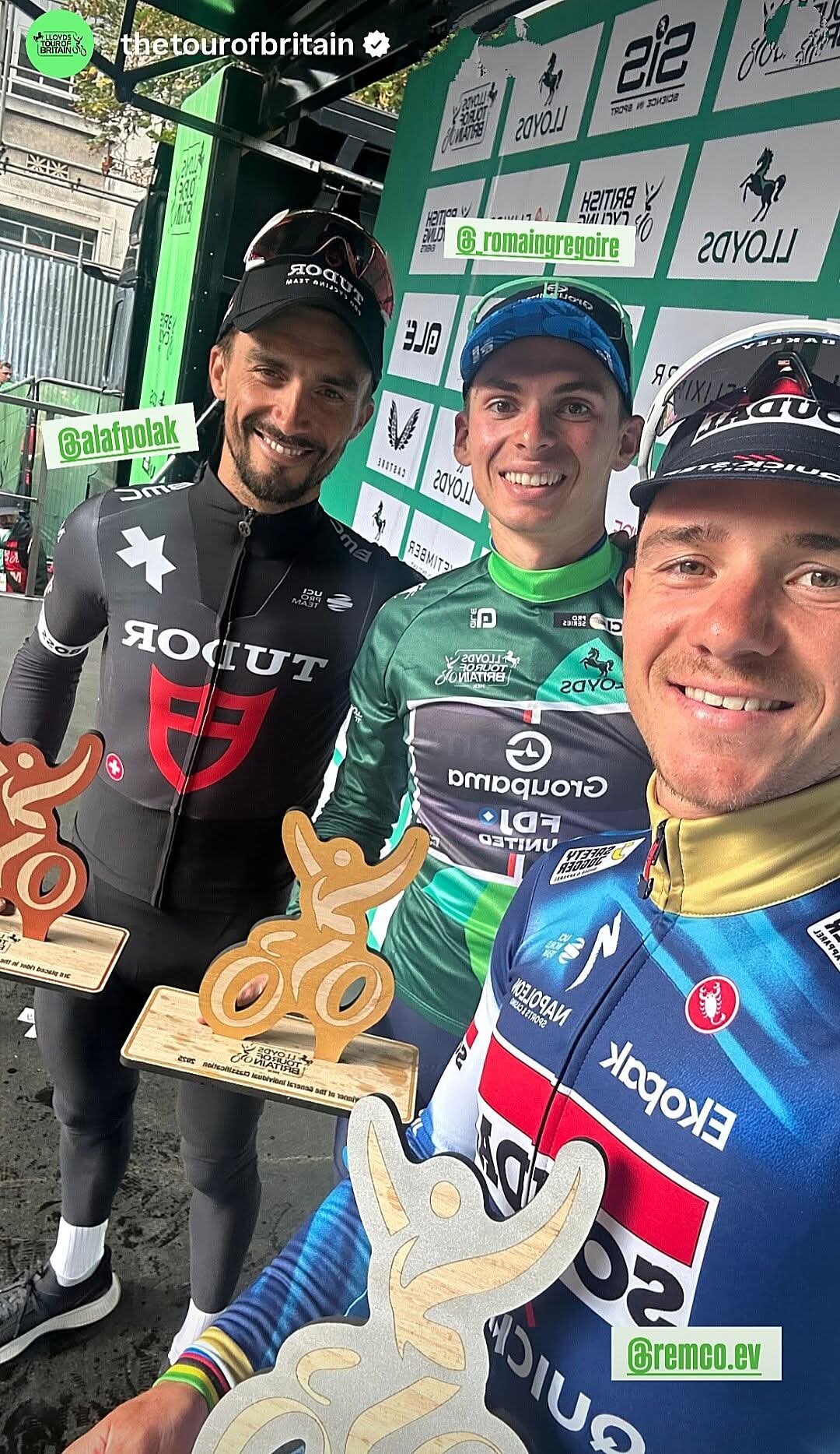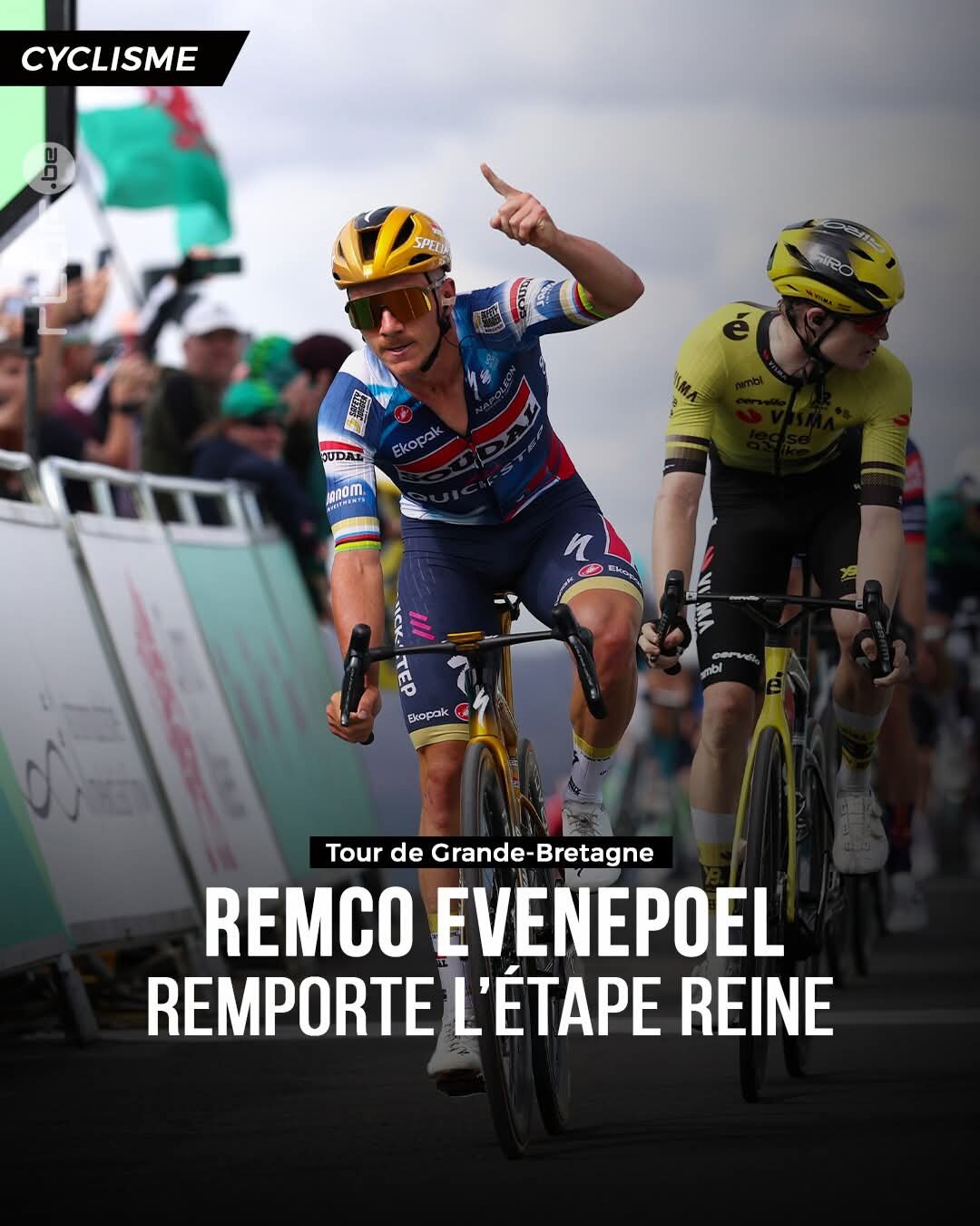 jeannot 0 Posté(e) 6 septembre 🇧🇪 Remco Evenepoel renoue avec la victoire !  Le Belge s'est imposé au sommet du Thumble devant Thomas Gloag et Oscar Onley. Il décroche ainsi sa 6e victoire de la saison. Son dernier succès remontait à la 5e étape du Tour de France, dans le contre-la-montre individuel.  Au classement général, Romain Grégoire conserve son maillot de leader. Partager ce message Lien à poster Partager sur d’autres sites